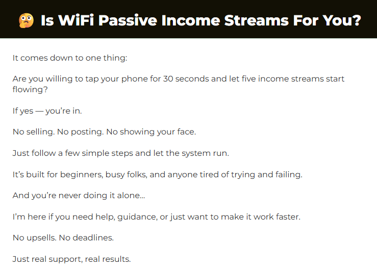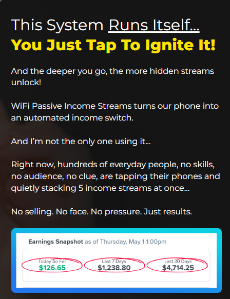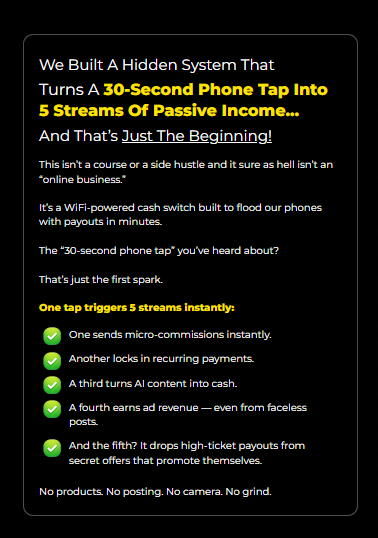 WiFi Passive Income Streams is a cloud-based, beginner-friendly app designed to create passive income streams by tapping into affiliate networks and using AI automation. Built for non-tech-savvy users, this tool claims to generate real income through simple mobile interactions—specifically, a so-called “30-second phone tap.” With no selling, no face-on-camera requirements, and no startup costs, this system positions itself as a solution for anyone looking to earn income with minimal time investment and zero technical knowledge.